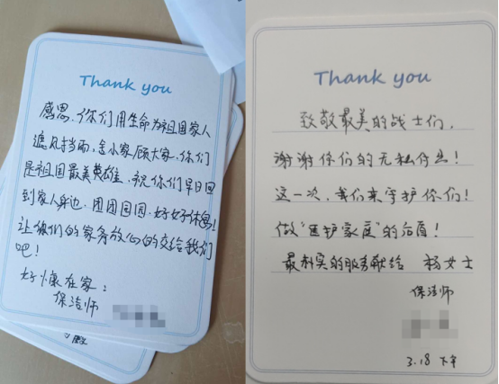 而在服务完成后,服务人员还会留下一张卡片。上面写着她们想对医护家庭想说的话,有的是鼓励,有的是感谢。
