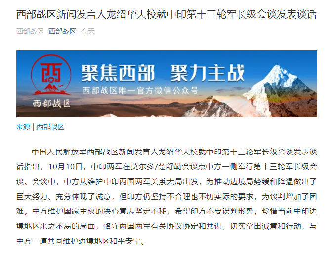 西部战区新闻发言人就中印第十三轮军长级会谈发表谈话