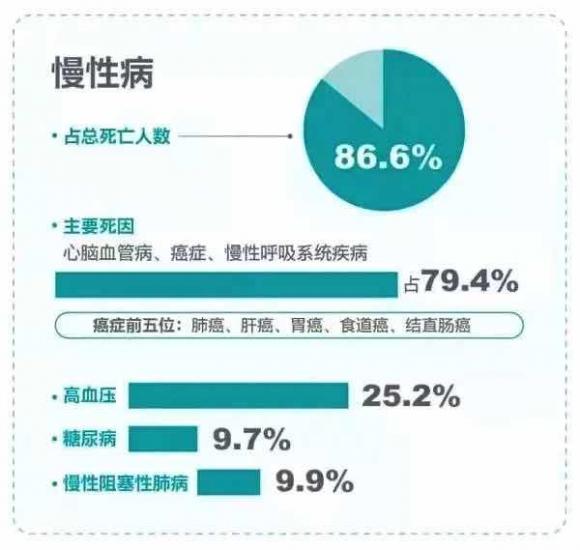 慢性病的危害还极大。在各种死亡因素中,慢性病导致的死亡占比近90%!其中,心脑血管病、癌症和慢性呼吸系统疾病是主要死因,占总死亡的近80%。