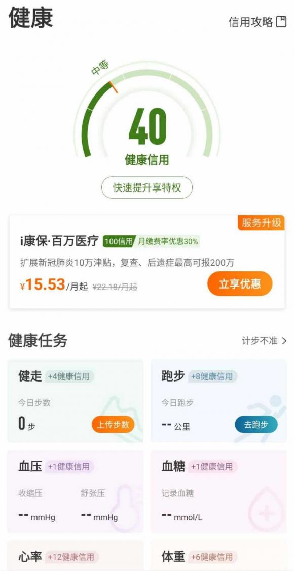 除了引导,还有激励。当健康信用分处于良好水平,用户就能享受一系列健康权益,包括在购买保险时享受最高30%的费率优惠。