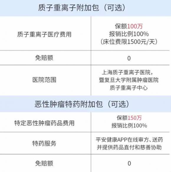 用户在投保时,还能根据自身需求,选择质子重离子附加包和恶性肿瘤特药附加包。这两项服务在平时都费用不菲,比如抗癌特药,不仅贵,有时还无处购买,平安健康则提供17种抗癌特药保障,保障范围内100%报销,保额最高150万。