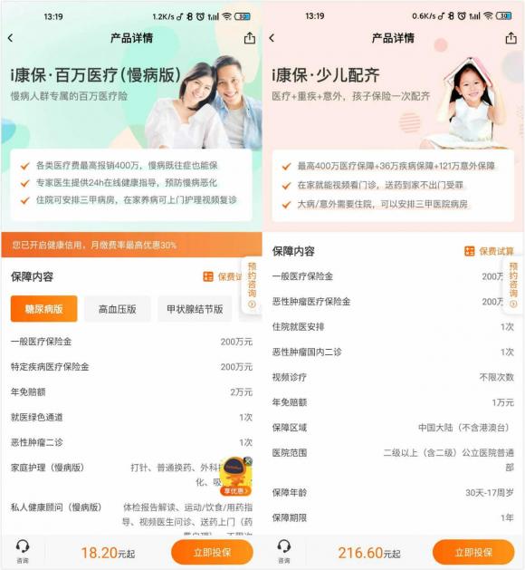 例如平安i康保·百万医疗(慢病版),有年缴和月缴两种方式,最低收费18.2元/月。还有针对孩子的i康保·少儿配齐,最低收费也仅216.6元/年。