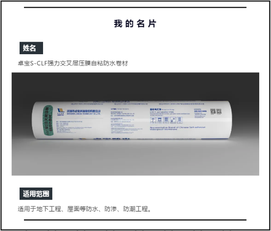 大家好,我是卓宝众多产品中,最年轻有为、又是最靓的仔——S-CLF强力交叉层压膜自粘防水卷材。