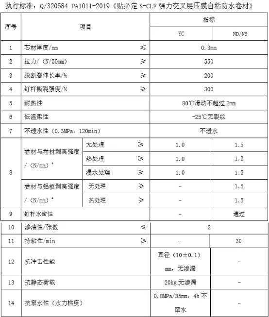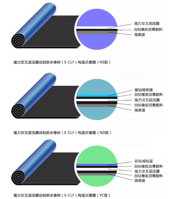 下面,允许我详细介绍下自己。我是由进口超强交叉层压膜、高性能配方的自粘橡胶沥青胶料、隔离膜组合而成的,是一种抗拉、延伸率和抗撕裂能力更强的无胎自粘防水卷材,具有优良的耐紫外线和稳定性。另外插一句,我一共三兄弟,分别是单面自粘(NS型)、双面自粘(ND型)和预铺反粘(YC型)。