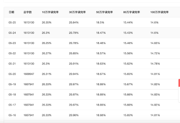 “字数读完率”,即为作品设置字数阶梯,比如10万字30万字50万字等,计算读者的读完比率。除了日常的算法推送之外,每部作品在达到固定字数时,会得到大幅度的流量推荐。平台会综合日常推送和流量推荐的情况进行计算。读完率的高低,会很大程度上影响作品接下来的平台资源分配。