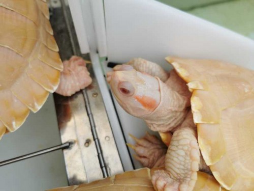 白化巴西龟顾名思义是“白化”之后的巴西龟,这类变异的乌龟表现出的形态为通体金黄,瞳孔是血红,虹膜为金色,有眼线,红耳明显,手脚有纹,背甲纹路多数会随着时间褪去。近两年价格开始亲民,也越来越普遍。