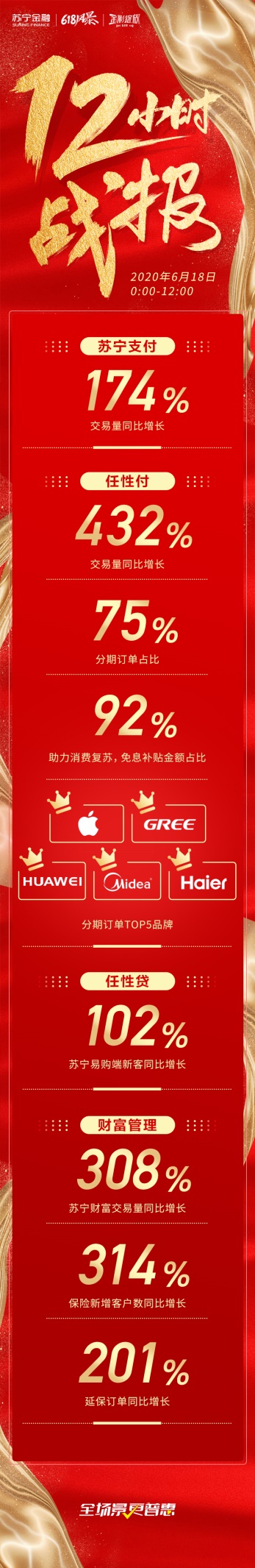 苏宁金融618大促十二小时战报新鲜出炉,战报数据显示,6月18日0点至12点,苏宁支付交易量同比增长174%;任性付交易量同比增长432%,分期订单占比75%,免息补贴金额占比92%,分期订单TOP5品牌为苹果、格力、华为、美的、海尔;任性贷苏宁易购端新客同比增长102%;苏宁财富整体交易量同比增长308%,保险新增客户数同比增长314%,延保订单同比增长201%。