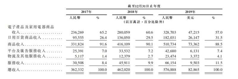 营收结构方面,日用百货商品收入在自营商品收入中占比提升,比重由2017年的26.4%提高到2019年的31.5%,上升5.1个百分点;服务收入的占比也提升了3.1个百分点。