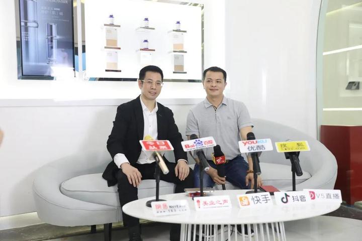 ▲石子义(左)与诺佳因总裁(右)接受媒体采访