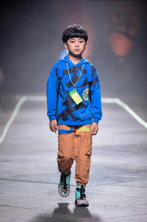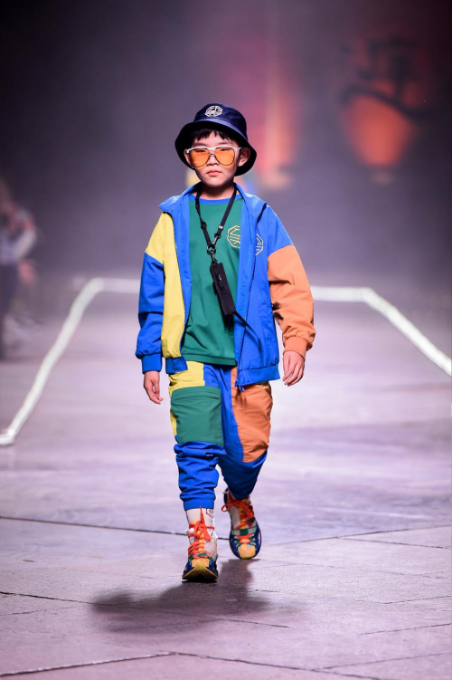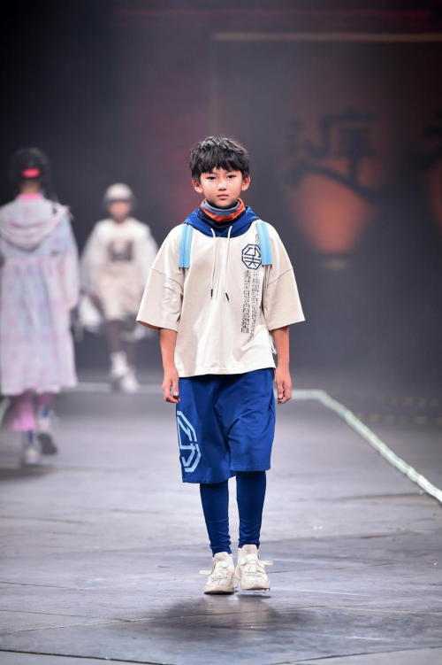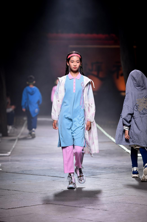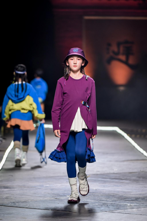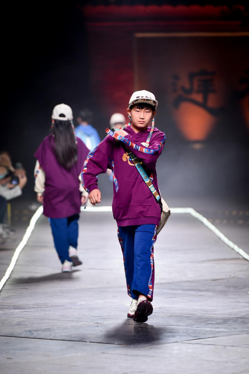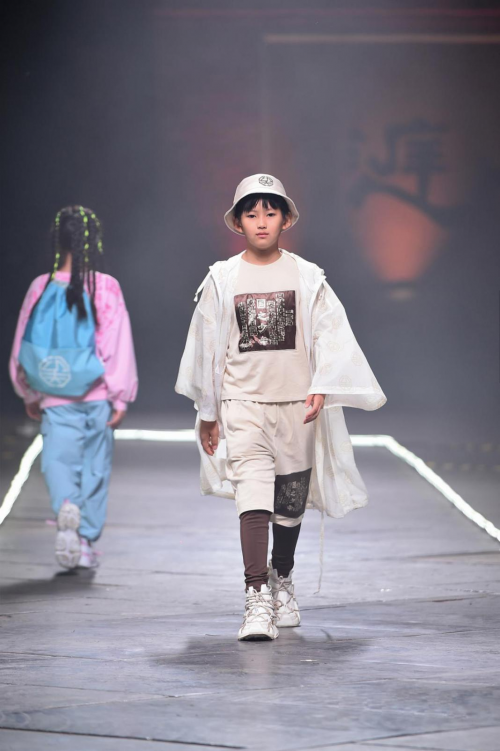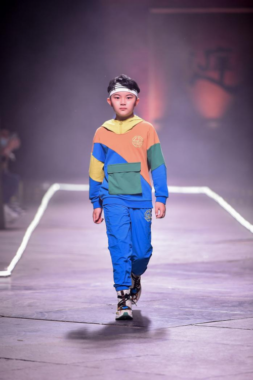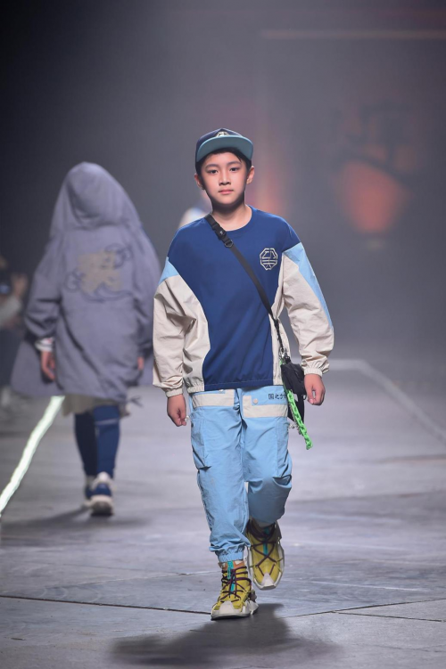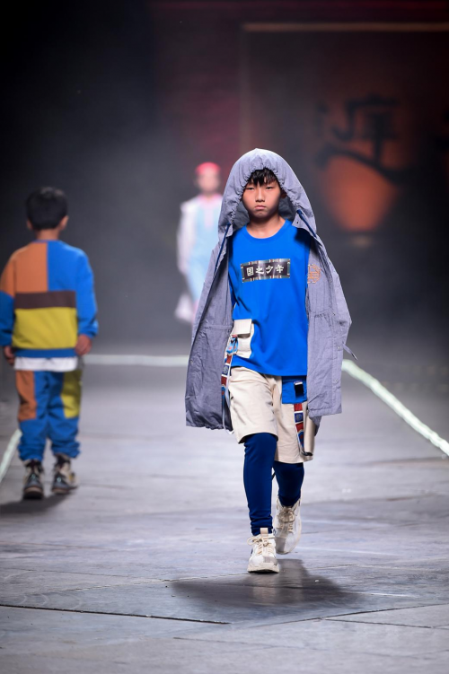 模特身穿特步儿童 x 少林全新联名「巭(gū)」系列亮相秀场。