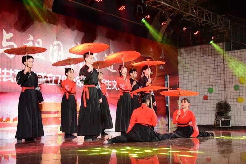 晚会紧扣“我与祖国共奋进”主题,各系部、学生社团都精心准备了精彩的节目,教工合唱团以《不忘初心》、《海韵》两首大合唱唱出了心声,唱出了技艺,赢得了师生们的喝彩;电子商务系学子展演了足球秀,拼出了“70”的字样,诚意满满;商贸管理系选送的《我亲爱的祖国》压轴登场,用台上、台下同步舞蹈,歌曲串烧、各民族舞蹈交互的方式,展示了较高的歌舞水平。此外,礼仪模特队携手17级服装设计专业同学,展演了多个系列的服装设计作品,服装设计的专业技能、礼仪队舞台走秀的功力,都令人耳目一新……