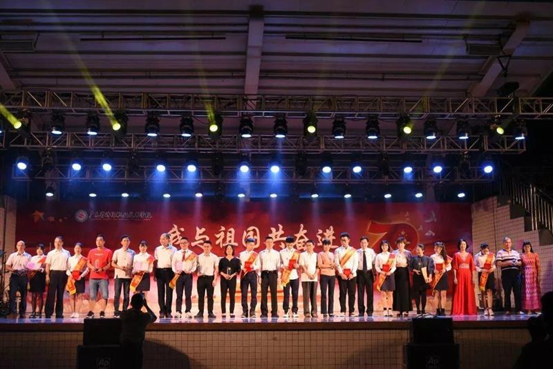 2019年9月24日晚,广东省财经职业技术学校在综合运动场举行了以“我与祖国共奋进”为主题的庆祝新中国成立70周年暨迎新生文艺晚会。学校党委书记、校长潘朝阳,副校长周永生、李广乾、李明龙、吴瑞明参加了晚会。晚会对获得学校第三届“十佳学生”进行表彰,并邀请“十佳学生”家长与师生们欢聚一堂共同观看演出。潘朝阳代表学校领导班子致辞。