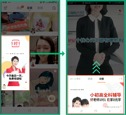 为了让用户能更直接的了解教育机构的投放产品,教育客户可在投放信息流场景时,选择将H5落地页前置,用户无需点击行为按钮,播放视频时就可以向上滑动自动打开H5落地页。这样的投放方式可大大缩短转化路径,提升引流效率。
