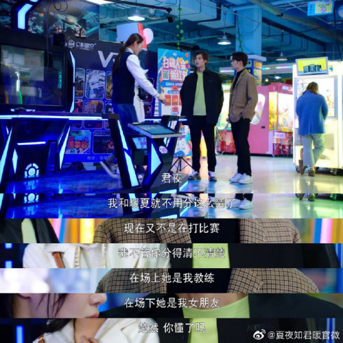 本以为经历了这么多的故事后,14集就应该是甜蜜的约会,结果却被楚然的一通电话打断。神话队邀青梦队成员去电玩城联谊。见面后的楚然和君夜也是剑拔弩张,暖夏走哪跟哪,还不断地较量比试,从冲锋枪到投篮。当然,最让我喜欢的还是君夜的那段当场霸气自曝——“我不管你分得清不清楚,在场上她是我教练,在场下她是我女朋友,你懂了吗”!
