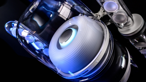 打开播放键,无线水晶四将展现出流光溢彩的环形状态指示光效,机身内部新增加了呼吸梦幻蓝色灯光,优雅的波纹光影效果,绚丽光影,光随乐动。