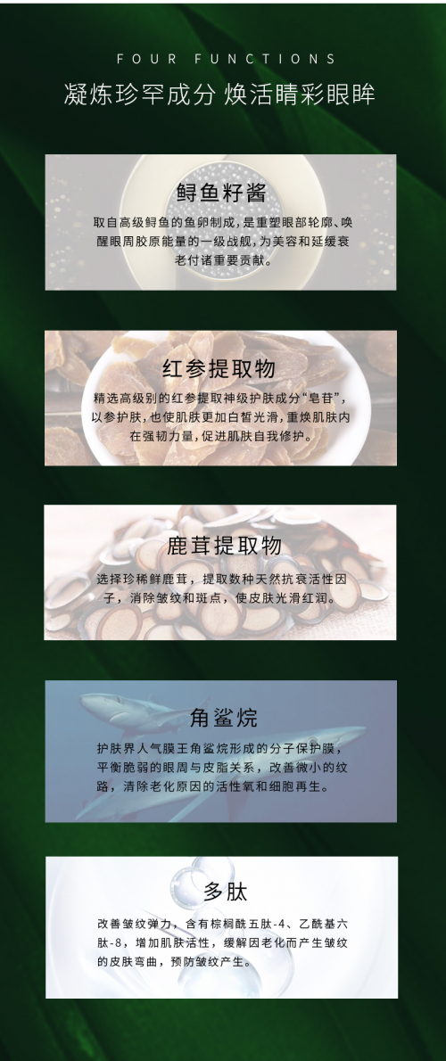 除了明星抗衰成分“鲟鱼籽酱”,UARE鱼籽酱奢润修护眼霜的这波搭配,称之为殿堂级药霜都不过分——还含有贵族红参提取物、膜王角鲨烷、珍稀的鹿茸提取物、多肽等,任何一种成分对于预防眼纹的发生、改善初期眼纹、提高眼周弹力活性和唤醒眼周胶原能量等方面都大有所为,可见其品质确实不一般。