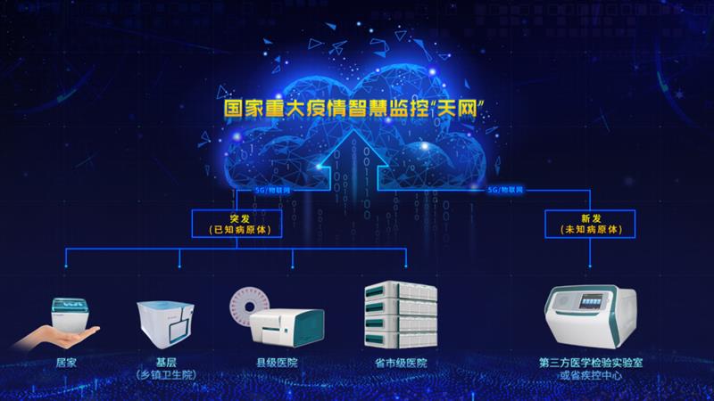 此次疫情的爆发给国家带来了前所未有的巨大损失,生命安全和生物安全领域的重大科技成果是“国之重器”,疫病防控和公共卫生应急体系是国家战略体系的重要组成部分。应对未来可能出现的新发突发传染病重大疫情,针对已知和未知病原微生物的芯片检测系统,通过人工大数据和新型传染源检测技术相结合,博奥晶典开发了网络化、实时化、自动化的重大疫情监控实时预警“天网”系统。一手诊断数据通过5G网络传输到“天网”系统,支持政府、疾控中心等部门面向全国全域式监控。