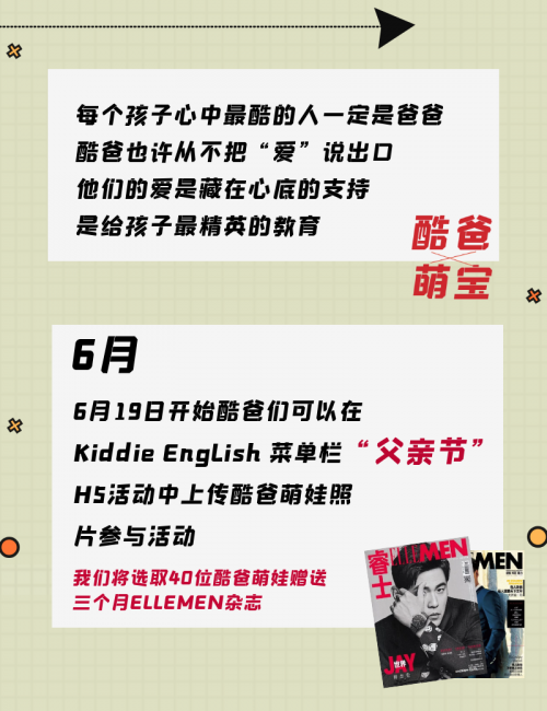 一个是全球高端教育品牌科蒂Kiddie,一个是代表精英男性的时尚杂志ELLEMEN睿士,在精神契合度上,ELLEMEN睿士所体现的男人风尚,内外兼修,不缺席的父爱正是科蒂这批精英爸爸们的理念和态度。