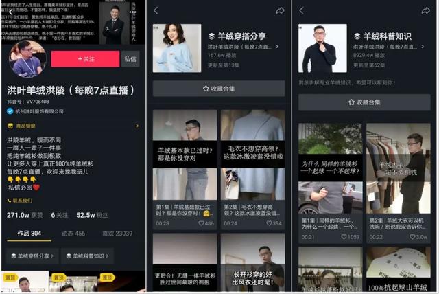 从2018年起,这家企业开始在抖音上创作关于羊绒知识和穿搭分享的短视频内容,经过两年时间的运营,目前洪陵羊绒的抖音账号已经拥有52.5万粉丝,300多条视频内容已经获得了近亿次播放。同时洪陵羊绒也在今年年初开始了直播带货,目前在抖音的销量已超1500万元,占全年营收的60%以上。