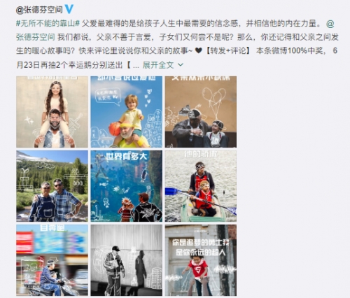 2020年6月21日父亲节,也正是一个可以增进亲子关系的好时机,张德芬空间与女性、情感、个人成长、心理、公益等相关品牌微博(蓝V、橙V、红V)跨界合作,在当天联合发起#无所不能的靠山#微博话题活动,聚焦父爱,唤醒子女感恩意识,为父亲节献礼。借此增强亲情,让大家回归感恩教育,从而也提升父亲在家庭教育中的影响力,促进家庭和谐。