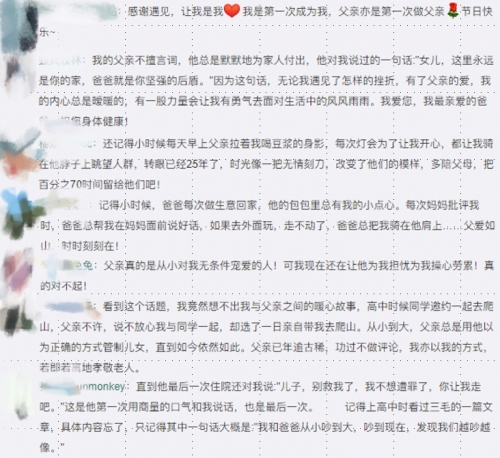 很多网友在张德芬空间父亲节微博活动中留言评论,回想过去与父亲相处的点滴,也描绘了自己心中父亲的形象,表达了对父亲的感谢。还有的网友反思现在与父亲的相处模式,认为自己长大后并没有向父亲传递过自己的孝心与关爱,但也会学着理解父亲,并写下了对父亲的感恩与美好的祝福。