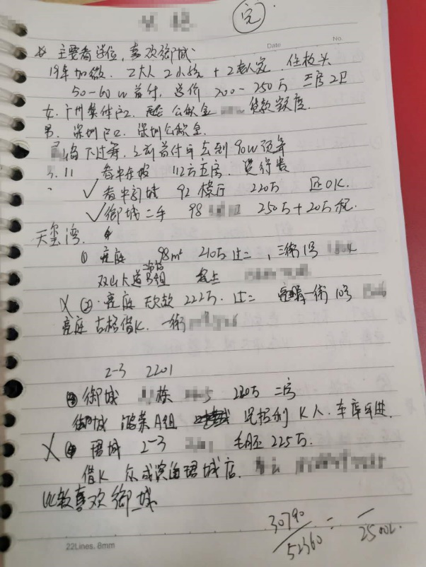 在客户跟进管理部分,每位客户的首付能力、购房资格,分期付款能力,每日带看喜欢/不喜欢的房源都被她细致地记录下来。“好记性不如烂笔头,在笔记本上做客户管理,这个习惯可以让我和客户的沟通记录都有迹可循,从而更准确地进行客户分类,提供精准的服务。“