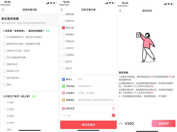 对发出需求单的家长用户,摩尔妈妈平台每单收取300元的匹配服务费。具体规则为,30天内平台为家长提供最多15次老师匹配机会,一旦老师通过家长的面试,即视为匹配成功,不可退款。但如果30天内,平台匹配了15次老师均未成功,或者已满30天,匹配老师尚未达到15次,都视为本单匹配失败,平台将在3-7个工作日内,为家长用户退款。