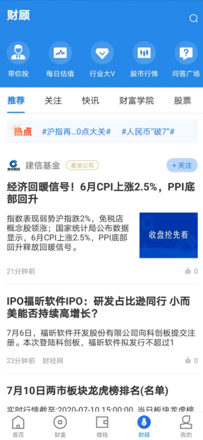 登陆苏宁金融APP,在首页右下角点击“财顾”就可以进入这个新“家”。大家首先看到的是苏宁金融为您“推荐”的各类资讯。权威、专业、多元、及时的资讯是科学理财、理性投资的基础和前提。为此,苏宁金融为您准备了四类资讯:一类是权威的报道,苏宁金融汇集了国内权威财经媒体关于宏观经济、行业发展的相关报道;二是专业的分析,苏宁金融整合了第三方的研报数据库,囊括了国内几乎所有券商和基金公司的分析报告;三是实时更新的快讯,苏宁金融从各个权威渠道抓取实时更新的市场动态,让您及时获取第一手的信息;四是市场热点,苏宁金融基于各个资讯平台的聚合指数综合人工判断为您筛选每日市场热点,并提供关于当前热点的分析文章。