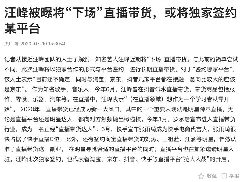 前不久618时候,摇滚圈的崔健、郑钧也在京东直播开演唱会呢!而且,汪峰作为摇滚音乐人,意向比较大的应该是京东!毕竟在7月10日,也有媒体爆料说,摇滚歌手汪峰将独家签约某电商平台,“下场”直播带货,并在与淘宝、抖音、京东等电商平台接洽,爆料称“意向比较大的应该是京东”。