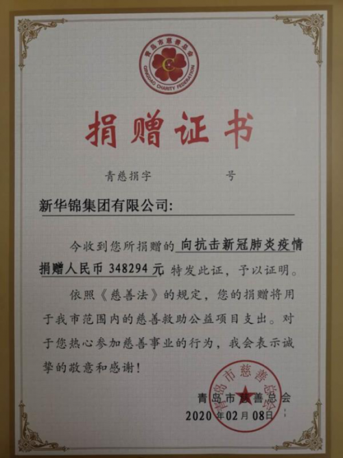 据悉,新华锦集团曾在疫情期间向全体员工发出了抗击疫情募捐活动的倡议书,共获得累计348294元爱心善款,通过转账的方式至青岛市慈善总会账户,由其全部捐赠给青岛的防疫一线;同时,新华锦集团还捐赠了价值100万元国内防控疫情急需的医用防护用品,助力青岛市抗击新型冠状病毒感染的肺炎疫情工作。
