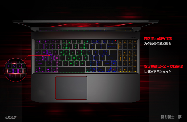 作为学习游戏的必需品,一个高冷硬核的学生,当然少不了一台匹配自己画风的电脑。说完它的内在不得不说它的外在了。暗影骑士 · 擎,高标配四区域RGB背光键盘,数字小键盘+全尺寸方向键,光影交错,如梦如幻,为您的信仰增加颜色,让征途不再迷失方向。绝对是笔记本电脑中的颜值担当。