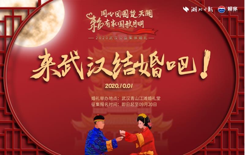 2020年10月1日(农历八月十五),是中国传统中秋佳节,也是中华人民共和国的国庆日。在这19年一遇的大喜日子里,由湖北日报主办、贵州赖茅酒业有限公司协办的“同心团圆楚天阔,赖有家国秋月明”公益集体婚礼将在武汉举办。9月10日至9月20日,主办方正式面向全国发出邀请,征集99对新人到武汉结婚。
