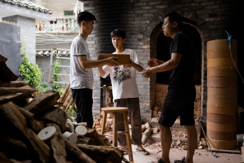 蒲石柴窑生产团队里大都是一些汉子,是能吃苦,亦是满腔热忱的工匠,既有技艺卓绝的老师傅,也有正值青春的小伙子。拉胚,修胚,吹釉,烧制,每一步工序,汉子们都做的一丝不苟。窑主石骏和工匠们经常一起搬运泥料,天气太热,就打个赤膊。每一道工序,窑主都会亲自把关,以求入窑烧制前万无一失。待器物入窑,石骏便和工匠们一起守着柴窑,披星戴月,以期无虞。虽有经验老到的把桩师傅,但柴窑的不可控性,可谓是“靠天吃饭”,只有把该做好的全都做好,才能静候佳音。窑主和伙伴们通常每次烧制都需要日夜守着柴窑烧足近30多小时,在1300度高温附近,寸步不离的把控,火舌冲天,不仅炙热难耐,让人汗如雨下,而且光亮灼刺双眼,让人不禁落泪。若非匠人真性情,有着对器物的珍爱和热忱,试问谁能数年如一日,坚守在这风火之畔呢?出窑后有“满盘皆输”的心酸,出窑也会有“色质俱佳”的狂喜,器物牵动着年轻匠人的悲喜,若非感同身受,寻常人难以理解为何匠人和柴窑器物如此“虐恋”?桃李不言,下自成蹊,绝伦的柴窑器物背后是匠人难以想象的付出,难以言表的痴情,难以彰显的浪漫情怀!