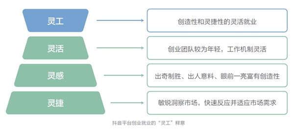 抖音就业人员规模庞大,类型多样,形态各异。《报告》认为,其就业特色可以用“灵工”来概括,即具有灵活、灵气和灵捷的特征,更强调多元化和创造力,不同于共享经济平台及传统“零工”就业特征。
