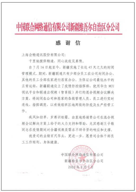在新疆疫情期间,通过会畅通讯与联通统一打造的云视频智享版平台,为超过300家客户提供了云视频SaaS账号,同时也提供了大量技术和商务支撑,获得新疆联通和客户的赞许。