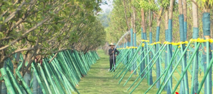 近日,在长江湖北省嘉鱼县神州堤段,一排排新植树木整齐划一。这是长江岸线生态修复的一个场景。