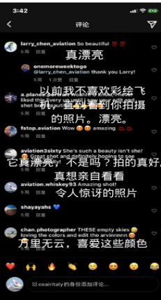 7月2日,东航与中国国际进口博览局合作推出了全球首架“进博号”主题彩绘飞机,隔日即启程首航法国巴黎,开启了“进博号”全球飞行之旅的新航季。在整个航季中,“进博号”化身进博空中形象大使,飞遍法国、加拿大、英国、荷兰、美国、韩国、日本、澳大利亚、斯里兰卡等欧、美、澳、亚各大洲10多个国家,以“东方魅力”向全球发出了“进博之约”,总里程超过了10万公里,完成了一次别样的“10万+”,获得雅虎、彭博社、美联社、法新社、意大利安莎社、俄罗斯文传电讯社等各国主流媒体的近千次报道。同时进博号的靓丽外形也引得国际航空发烧友的高度关注和“蹲守”拍摄,在多个海外社交媒体平台#和“进博号”一起飞、“Fly with CIIE”等话题受到热议。部分网友留言截图如下: