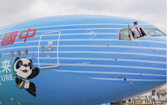 “进博号”是在东航目前载客量最大、航程最远、搭载全球领先客舱服务系统的国际远程旗舰宽体机——波音777-300ER飞机上进行的喷涂,整个彩绘以进博主色调黄蓝两色为基色、吉祥物“进宝”手持四叶草,实现了进博文化和飞机美学的完美融合,向各国旅客带去幸运与祝福,传递开放合作的进博理念。