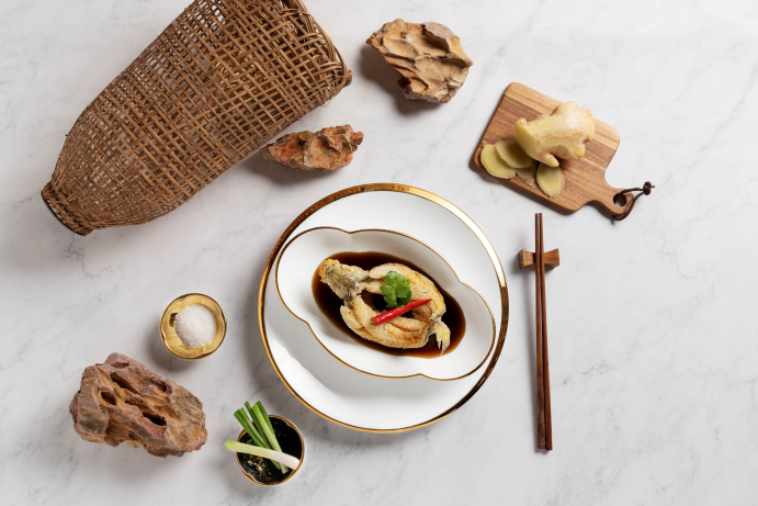 这8 道粤菜经典菜肴,包括爆汁脆皮鸡(万豪脆皮鸡)、香醋酥嫩黄花鱼(滋味黄花鱼)、碧玉松露煎明虾(松露汁煎明虾)、热石酒香银鳕鱼(石烤银鳕鱼)、银骨炭烤猪梅花(蜜汁叉烧皇)、玉液花胶汤(火瞳花胶汤)、霜化雪龙牛(特色文火雪龙牛)以及鲜蚝汁淋黄金九孔鲍(蚝汁鲜鲍鱼)。代表着广东饮食文化中的精细与讲究的火腿花胶汤,从选材到烹制精心料理都渗透着厨师匠心,只选用3年以上的火腿骨进行烤制并熬制汤底,多次过滤多余油脂以确保汤品的清润可口,暖味于心;脆皮鸡的鲜香脆嫩呈现出厨师们对于细节的追求,只选用2斤8两的鸡入味,从腌制,风干,烹饪到完成需要长达6个多小时的过程,使这道传统的广府美味犹如在时光中流转;滋味黄花鱼侧重于调味料的搭配,使其口感酥香而不腻,以5种老陈醋调制并发酵12小时的佐料,为每位食客烹饪出一道始于技艺的粤式菜肴。