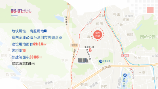 清水河06-01地块:位于清水河一路与清水河三路交界处,建筑用地面积6918.5 m²,地块属性为商服用地C1,意向企业必须为深圳市总部企业。