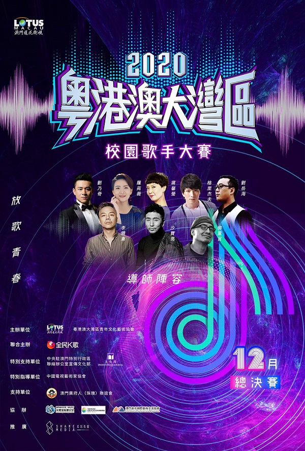 “声动大湾区,青春再来袭!”新一季的2020“粤港澳大湾区校园歌手大赛”,于9月21日在线正式启动。赛事由澳门莲花卫视和粤港澳大湾区青年文化艺术协会主办,全民K歌联合主办,中国电视艺术家协会担任特别指导单位,澳门中联办宣文部、澳门特区政府文化局为特别支持单位,澳门广府人(珠玑)联谊会为支持单位,澳门科技大学文体发展办公室与莲花国际艺术交流协会及澳门新新教育协办。