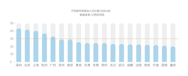 《蓝皮书》调研数据显示,当代租客有着自己的租住幸福“双30法则”,即“30分钟以内通勤+30%工资以内房租”。而据贝壳研究院数据指出,杭州紧随深圳、北京、上海之后,成为唯一一个房租占收入超过30%的新一线城市,并且占比略高于广州。