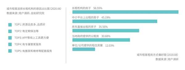 数据显示,有超过56%的租客表示会选择“长租机构的房子”,超越“中介平台的房子”及“房东直接出租的房子”。