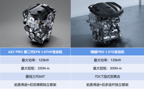 博越PRO则是搭载了吉利汽车第三代1.8TD发动机,与之匹配的也是自主研发的7速湿式双离合变速箱。单从功率数据上来看,博越PRO是比AX7 PRO胜出些许,但不得不承认AX7 PRO具备合资血统的三大件,在技术与燃油经济性上实则更加值得我们信赖。