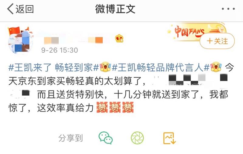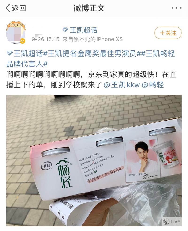 以伊利畅轻直播专场为例,直播还在进行,微博上已有不少王凯粉丝晒单和网友反馈收到货了,“送货特别快,十几分钟就到家了”,能够在直播间跟偶像一起喝上酸奶,“这效率真给力”!