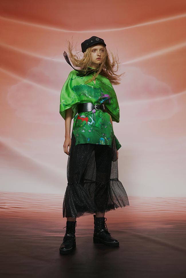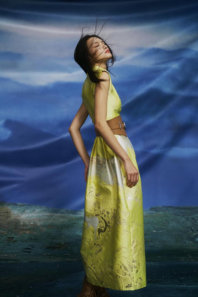 本季从开场军绿与卡其带出军装元素,展现出木兰踏上征途的勇气及决心; 中段以大量黑白为基底,结合了独家开版缇花以及手工刺绣图腾,象征着沿路的风景以及心境上的转变; 结尾则以迸发的色彩如正黄色、渐层的鲜绿以及粉红、荧光桃粉,结合涂鸦印花,诠释着经历一切后,一个女人生命旅程轴线的转变,以及拥抱希望与未来的光辉。