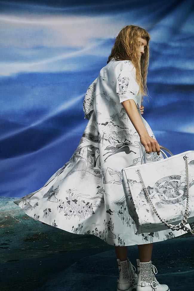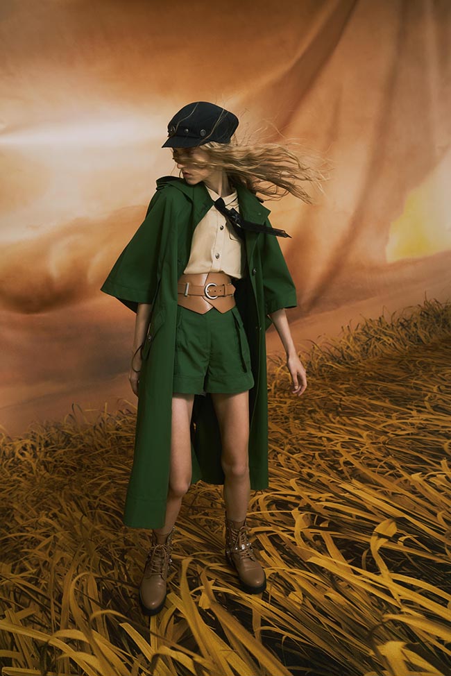 本季的轮廓以利落的中性样貌为出发,带有军装风格的正装搭配宽松的缩口裤或穿插大口袋短裤、连身泳衣与竞速裤混搭透肤长裙增加律动感,搭配上以刺绣、印花、网纱演绎的窄版领带,收敛女性温婉气质,造型上搭配从骑马装束延伸而成的皮革腰封以及棉质马甲强调腰部曲线,性感魅力不减,并展露独立自主的直率气息。