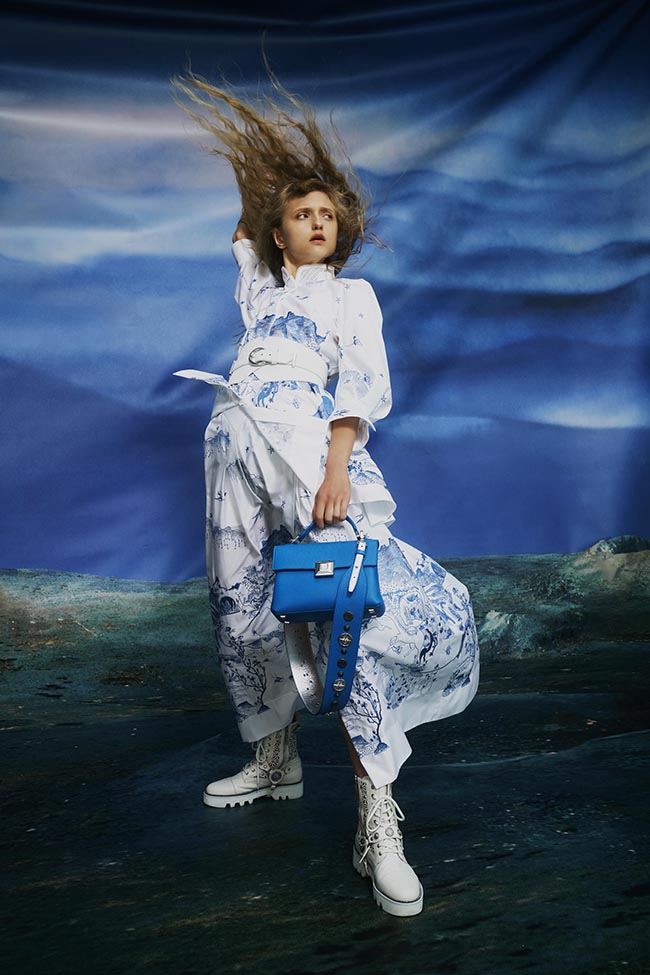 另外,鞋履在本季的设计中加入马具的概念延伸,推出短筒军靴和平底凉鞋,皮带与钉扣的搭配装饰十分抢眼,鞋后跟仿剑鞘的皮带扣饰呼应军旅风格,侧边的窗棂图纹除了透气的功能外也是品牌经典的配件元素,整体虽展现出刚强气息却妆点了几分优雅柔美。