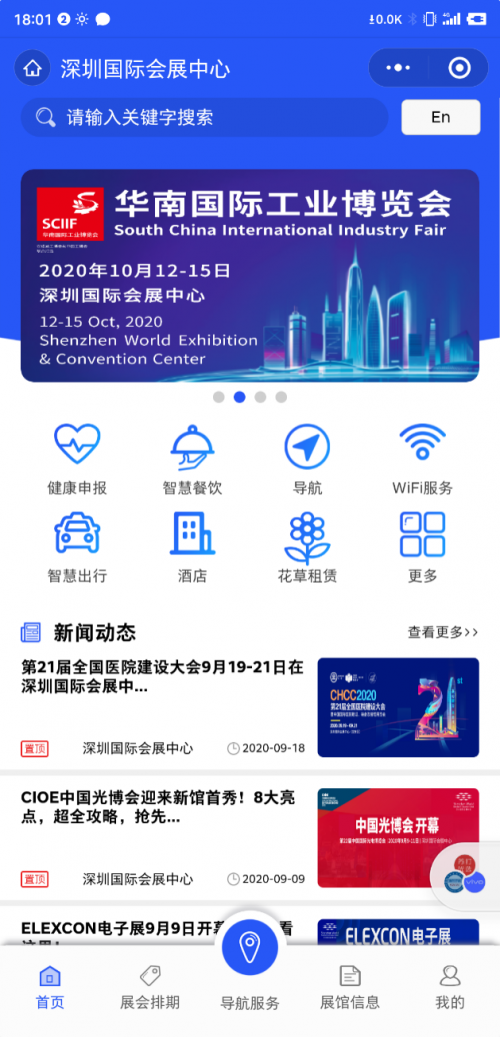 除此之外,为丰富、优化观众的观展体验,为来到展馆的客人带来更多的便利,深圳国际会展中心推出智慧服务平台(官方小程序),提供导航、智慧停车、健康申报、智慧餐饮、智慧出行等十余项功能与服务。以导航功能为例,平台不仅具有模拟导航、实时导航模式,还设有AR实景导航模式,解决用户方向感差、看不懂平面地图的烦恼。在导航页面中,逛展用户可以在馆内、外导航灵活切换,还会收到跨层导航人性化提示,并且可以发送和共享好友位置,用户来馆、馆内各场景定位与导航需求得到了一站式解决。智慧餐饮也为展会期间庞大的人流显示了各项餐饮地点的高峰情况,方便逛展人群错峰进餐,保障大家的餐饮体验。