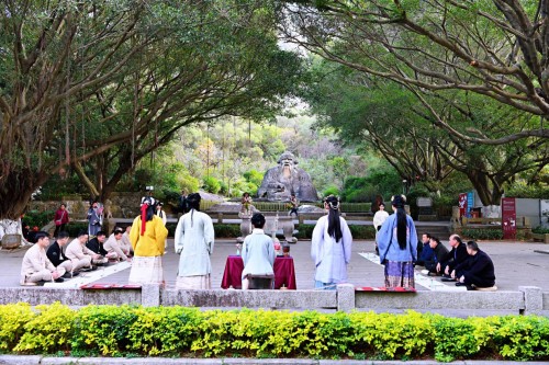 活动当天上午,在清源山老君岩广场前还举行了庄严的请茶仪式。感德茶馆八家入驻茶企、感德茶师傅行盥洗礼入座,由泉州汉服天下带来请茶舞表演,现场品乐赏艺,同赏茶舞。“感德茶师,技艺超群;匠心传承,更勇担当…”随后,八位感德茶师傅列队整齐,在老君岩前庄重地吟诵《感德茶师傅宣言》。吟诵完毕,感德茶馆八家茶企代表、八位感德茶师傅举起手中的茶杯,依次向老君奉茶。